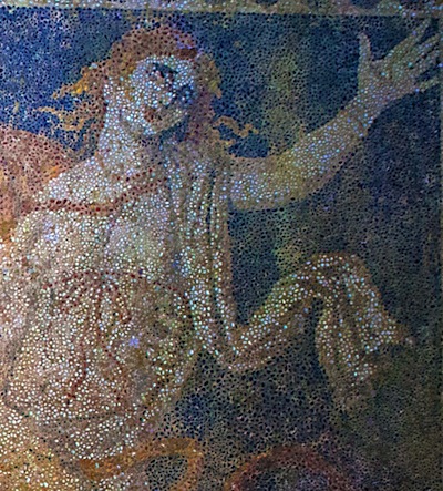 In a series of impressive pictures released by the ministry, the female figure is shown with fiery red hair, cloaked in a white robe fastened together with a red ribbon. She raises her left hand and wears a bracelet. Archaeologists are now certain that the mosaic, 4.5 by 3 meters, depicts the abduction of Persephone by Pluto.
