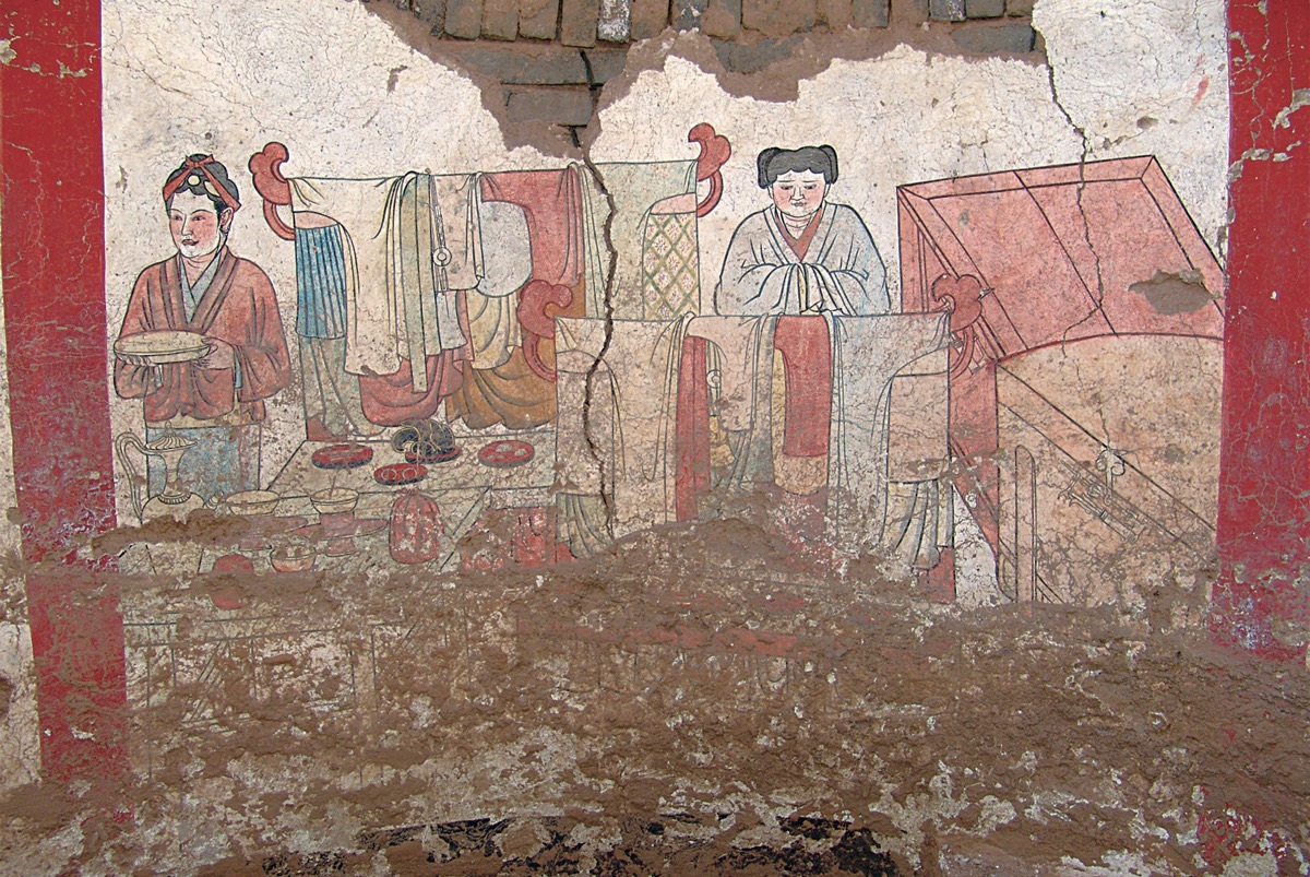 Murals on the west wall of the 1,000-year-old tomb. Numerous articles of clothing are depicted hanging on stands. Two servants can also be seen. On the far right, two chests, one red and the other beige, can also be seen. Credit: Courtesy of Chinese Cultural Relics