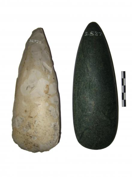 It is point-butted axes like these that Danish archaeologist Lasse Sørensen has studied. His study concludes that the first Scandinavian farmers were immigrants. Pictured on the left is a point-butted axe in flint. The one on the right is made from jade. (Photo: Lasse Sørensen)