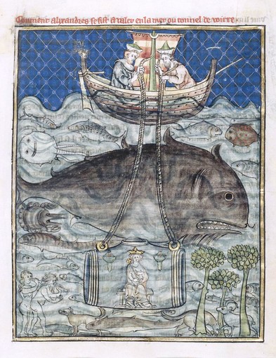 The concept of history in the Middle Ages was not what it is today, as visitors to the J. Paul Getty Museum's new exhibition of manuscripts will see. In an eye-popping image from "Romance of Alexander," a book made in the 1290s, an unknown artist illustrated a yarn about Alexander the Great making an underwater expedition. Enthroned in a glass diving bell, below a whale that gobbles up much of the pictorial space, the regal explorer calmly observes a colony of nude people, earthly beasts and fruit trees living at the bottom of the sea.