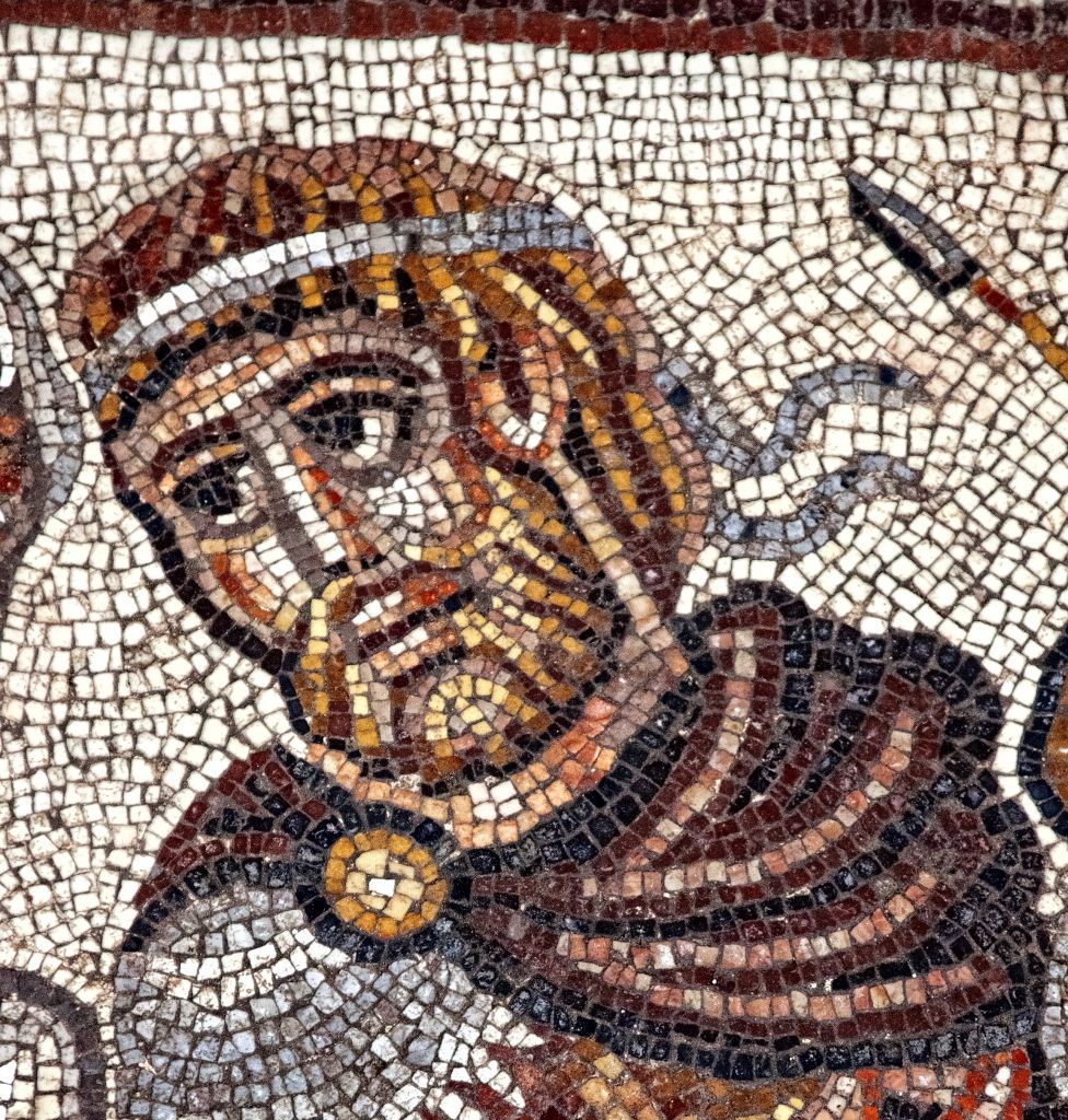 Detail of the head of a Greek military ruler in the Huqoq synagogue’s 5th century mosaic. (photo credit: Jim Haberman)
