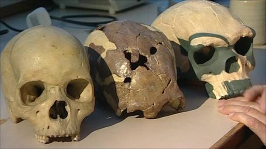 Professor Chris Stringer compares one of the 13,000-year-old skulls (centre) with modern (l) and ancient (r) African fossils