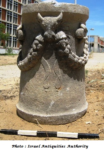 Jerusalem. Des travaux de construction menés à l’Hôpital Barzilai ont permis de mettre au jour un magnifique autel païen datant de la période romaine (Ier – IIe siècle). L’autel est taillé dans du granit et il a été trouvé au centre d’une nécropole. Haut de 0.60 m. il est décoré de têtes de taureaux et de guirlandes de laurier agrémentées de grappes de raisins et de feuilles.