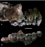 Figure 2. Left maxilla of KNM-WK 24300 in (a) occlusal and (b) lateral view. Scale bar = 1 cm.