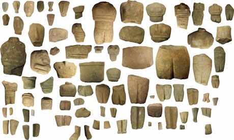 Some of the thousands of deliberately broken figurines, none of which fit together, which archaeologists believe were part of a mysterious rite which took place about 4,500 years ago on the Aegean island of Keros. Photograph: Cambridge University/PA