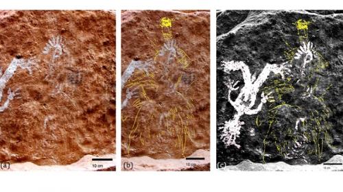 Scratch-work and painted rock art in the southern Kimberley (a) unenhanced panel (b) the same panel with the scratch-work highlighted to show a Wanjina like figure with headdress (c) white painted figure partially superimposed over the cratch-work shows its more recent age. Credit: Bunuba