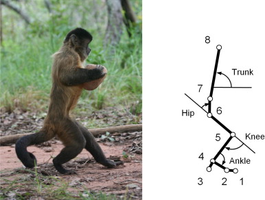 A bearded capuchin monkey (Sapajus libidinosus) carrying a stone and a nut (left). Photo by Noemi Spagnoletti. The anthropometric model employed to describe movement, and the joint angle convention (right). The anatomical landmarks digitized were: 1. Tip of the second toe; 2. Second metatarsal phalangeal; 3. Heel; 4. Lateral malleolus; 5. Knee joint center; 6. Trochanter; 7 Iliac crest; 8. C5 vertebra.