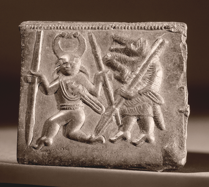 A bronze Viking plate from the 6th century A.D. depicts a helmeted figure who may be the god Odin dancing with a warrior wearing a wolf mask. (National Historical Museum Stockholm)