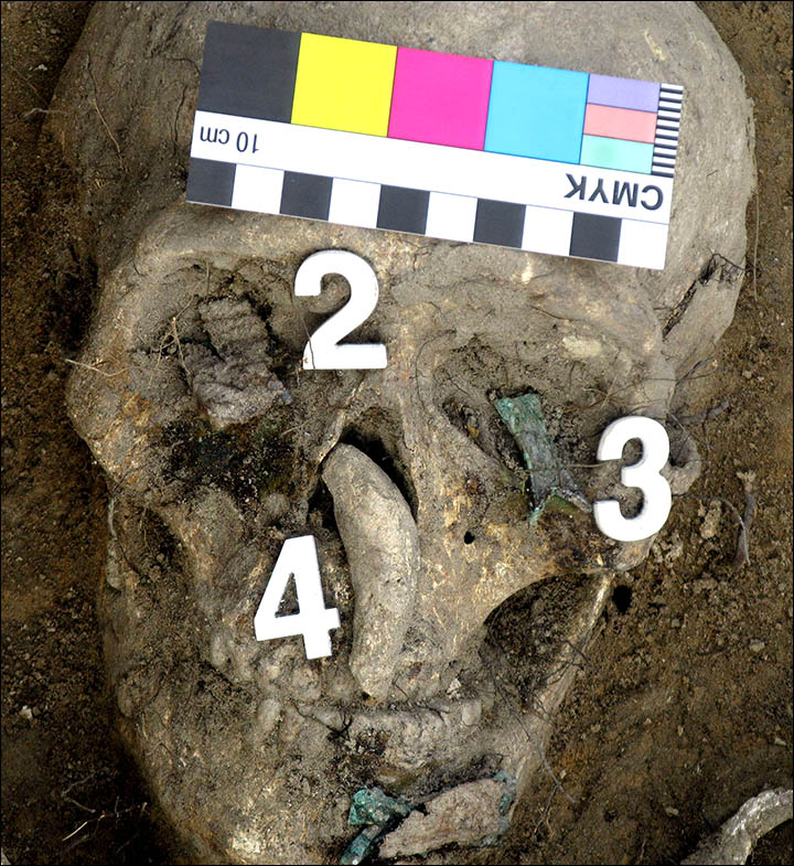 The death mask, with number 4 marking the bear's fang, and numbers 2 and 4 showing metal fish figurines with broken-off heads that were covering the warrior's eye sockets. Picture: Institute of Archeology and Ethnography, Siberian branch of Russian Academy of Sciences
