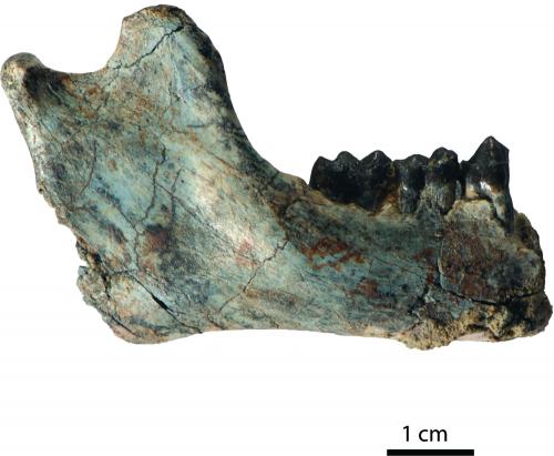 Two fossil discoveries from the East African Rift reveal new information about the evolution of primates, according to a study published online in Nature this week led by Ohio University scientists. This image shows a holotype specimen of Rukwapithecus fleaglei (RRBP 12444A), a partial right mandible bearing the lower fourth premolar, first and second molars, and partially erupted third molar, in lateral view. Credit: Patrick O'Connor, Ohio University Heritage College of Osteopathic Medicine