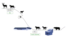 Figure 3. Reconstruction of ungulate distribution in the landscape surrounding the site of Payre (indicated by the star) based on enamel carbonate δ13C and δ18O values and compared to lithic resources distribution. Horse, rhinoceros and large bovids fed in the Rhône Valley; red deer and large bovids on the limestone plateaus; tahr and chamois fed on the slopes. Main prey species of Neanderthals were horse, red deer and large bovids.