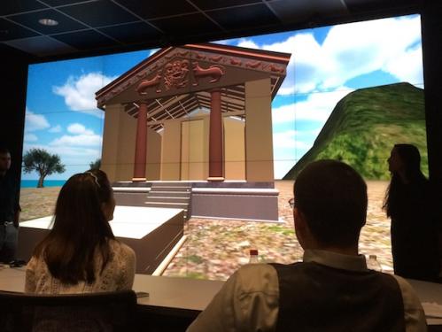 Students take in the grandeur of an ancient Roman temple, reconstructed with architectural and interactive 3-D gaming software from archaeological and historical records, at Rice's DAVinCI Visualization Wall.