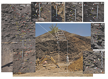 Most of the investigated slag heaps have been cut by modern roads or mining activities in the past, so that large scale excavations were not necessary in the current project. The exposed cross-sections, up to 25m high at Skouriotissa, were sampled using mechanical equipment (Figure 2) or by excavating narrow stepped trenches (Figure 3). The stratigraphy of the heaps and their environmental context were recorded by a LiDAR scanning instrument, a reflector-less total station and high resolution digital photography. The recording included several newly exposed slag deposits that are likely to be removed in the near future by modern mining activities (Figure 4).