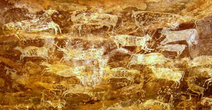 Here are prehistoric paintings of hoofed animals in a cave with thunderous reverberations located in Bhimbetka, India. Credit: S. Waller