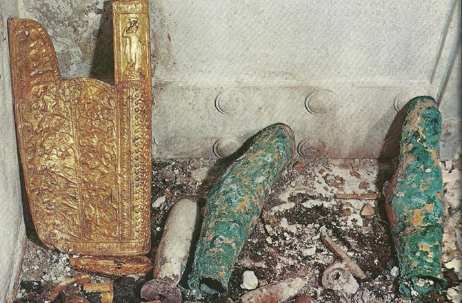 Tomb II remained undisturbed and contained the almost complete cremated remains of a male skeleton in the main chamber and the cremated remains of a female in the antechamber. Grave goods included silver and bronze vessels, gold wreaths, weapons, armor and two gold larnakes.