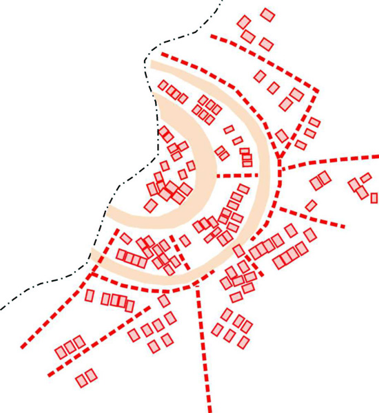 The houses are arranged in an arc along the fortifications, with alleys 1 to 1.5-metres wide between them. This model of development, called Anatolian, has its prototype in the eastern Mediterranean area, in locations such as Troy and Mycenae, and also in the Eurasian part of present-day Russia and northern Kazakhstan. In central Europe, it is the only settlement of this type and extent; other settlements from this period were much smaller, having had up to 300 inhabitants.